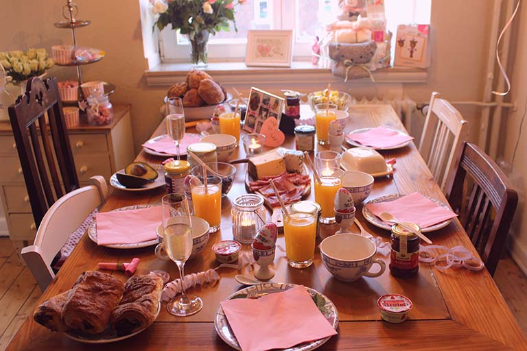 Am Tag der Überraschung wurde ich also von ihr zur vermeintlichen Besichtigung im zweiten Stock ihres Hauses begleitet. Die eingeweihten Nachbarn haben fantastisch mitgespielt und hatten ihren Spaß an unserem Ablenkungsmanöver. Nach 40 Minuten ausgiebiger Führung durch die Räumlichkeiten, waren wir dann beide erst einmal platt und beschlossen, noch einen Kaffee in ihrer Wohnung zu trinken. Perfekt! Denn dort warteten natürlich schon all ihre Lieben im fertig dekorierten Esszimmer auf unsere Ankunft: “1, 2, 3: Überraschung!” Nachbarn wurden wir zwar leider nicht, aber dafür war die Babyparty-Überraschung umso schöner! Neben Freudentränen und ungläubigen Blicken, fanden wir vor allem eines vor: eine vor Glück strahlende werdende Mama. Du möchtest jetzt auch gleich mit der Planung beginnen? Hier sind einige Tipps und Ideen für Deine Baby-Shower: